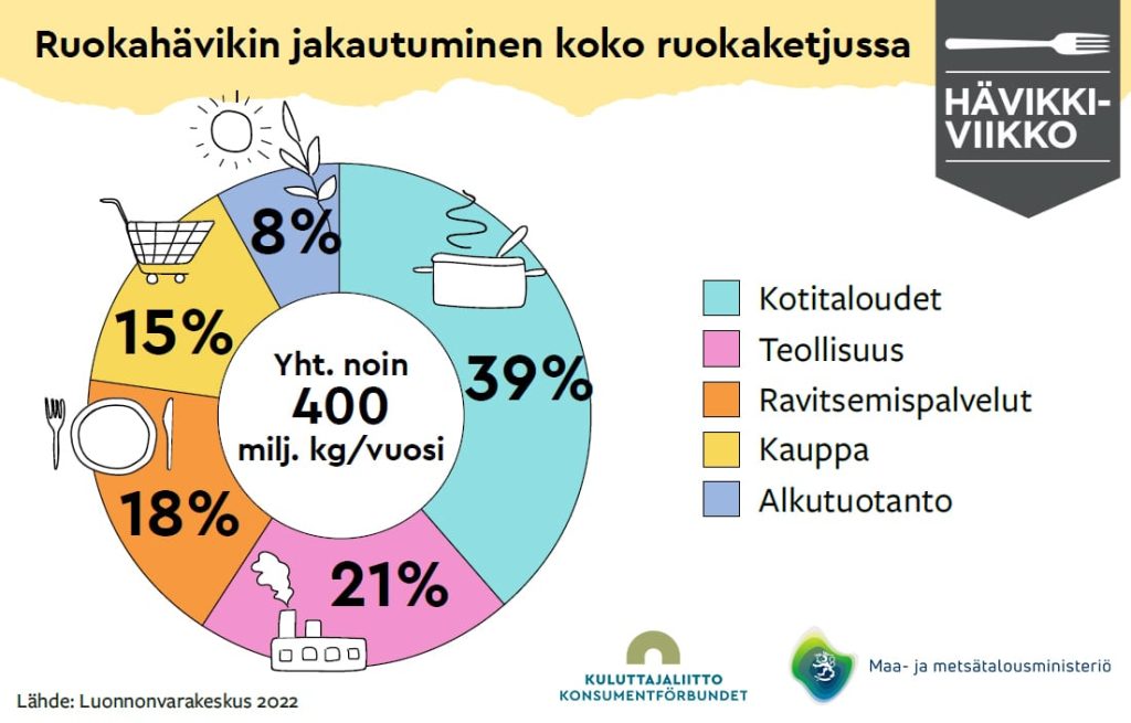 - Suomalaisissa kotitalouksissa ruokahävikkiä muodostuu 137 miljoonaa kiloa vuodessa
